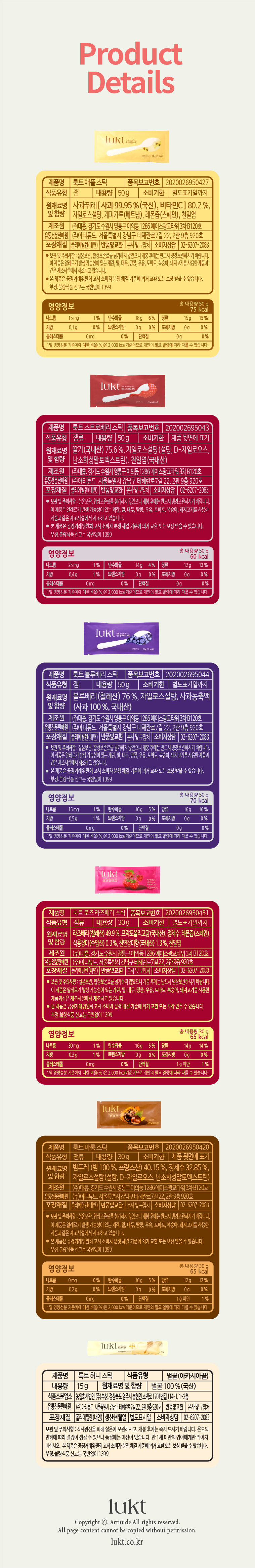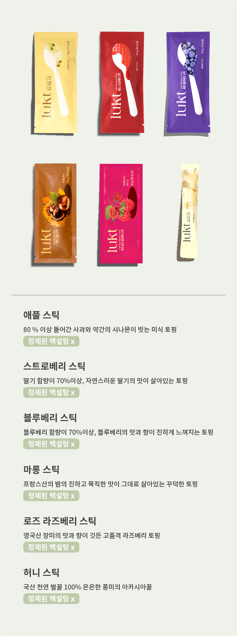 룩트의 모든 과일 스틱 & 허니 스틱 토핑을 맛 볼 수 있는 1회 용량 토핑 6종 구성입니다.